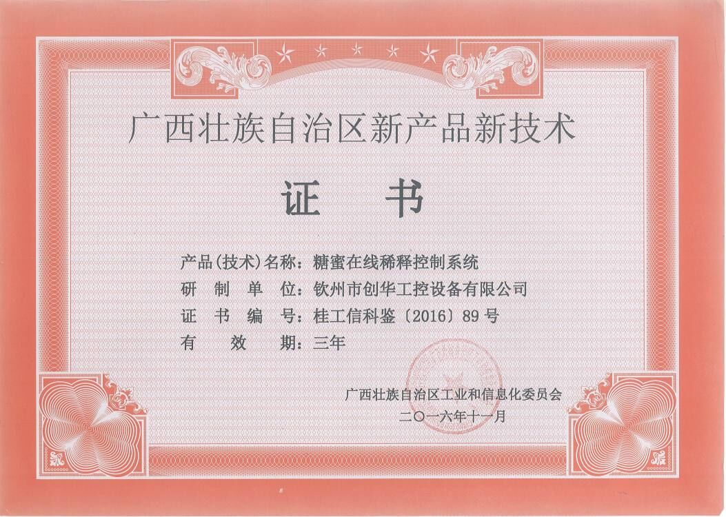 糖蜜在線稀釋控制系統(tǒng)新產(chǎn)品證書(shū)